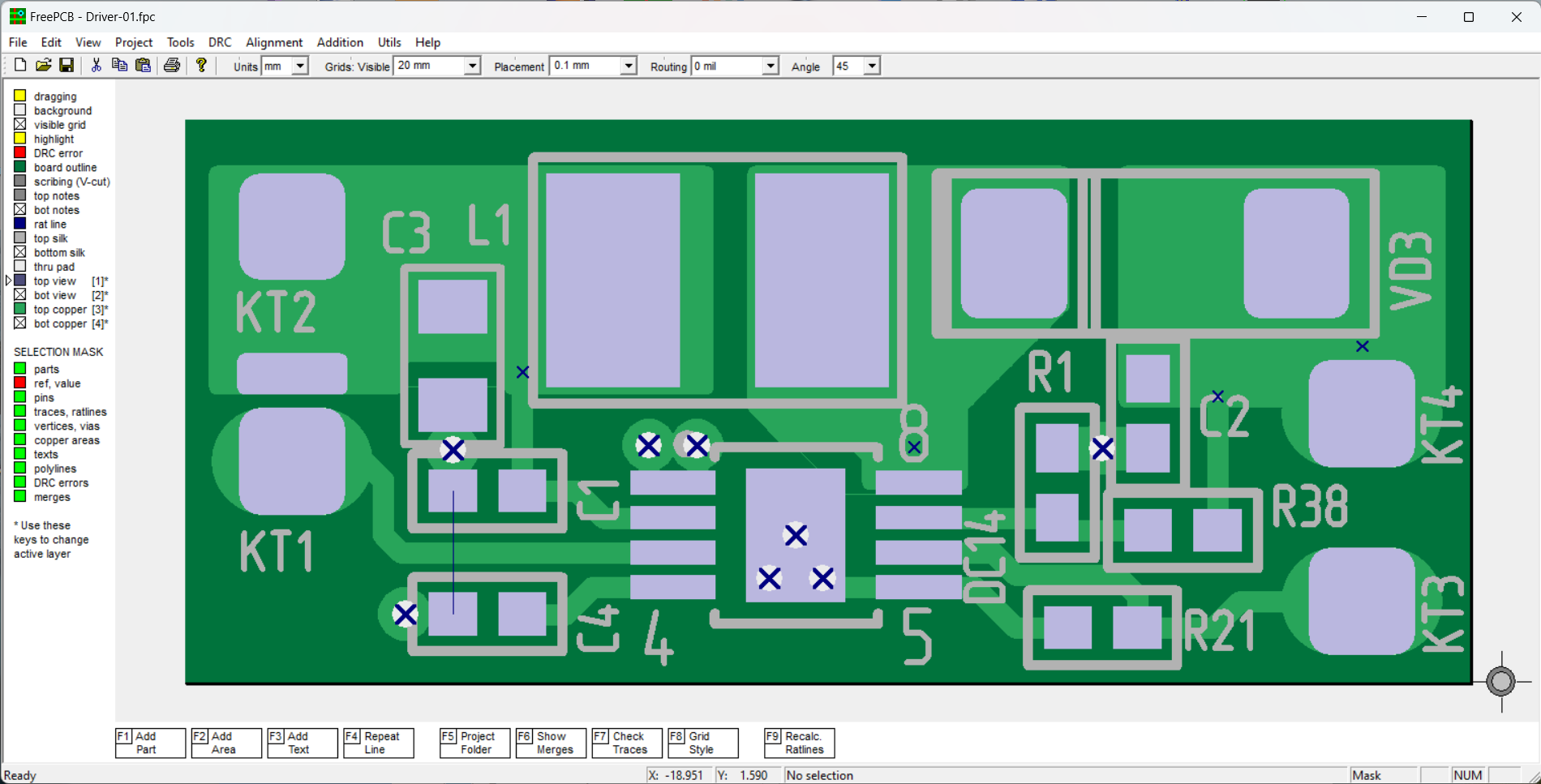 | 2.4.27 | Поиск футпринтов по расстоянию между пинами, альтернативные функции пина на схеме, область запрета в футпринте, требование проверки DRC перед генерацией герберов, панелизация с репперными знаками на стадии формирования герберов, фрезерный контур для панелизации плат со сложным контуром, симметризация мультизаготовки для оптимизации производства, генерация CSV-report для панелизированных плат, DXF для лазерного гравёра, G-CODE для фрезерного станка, интерактивный вид печатной в схематоре (скрипт), ноуды на концах полилинии(F9), возм.сепарированной печати ПДФ в один файл, проекции слоя TOP_COPPER или BOTTOM_COPPER и ещё 11 новых видовых вариантов в OpenSCAD, оптимизация, мелкие доработки | планируется 10.10.2025 |